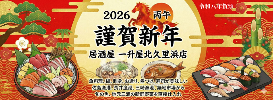 北久里浜の居酒屋、一升屋では季節の新鮮で美味しい魚や野菜のお料理と日本の銘酒が楽しめます。各種宴会コースもご用意しております。皆様のご来店を心よりお待ちしております。
